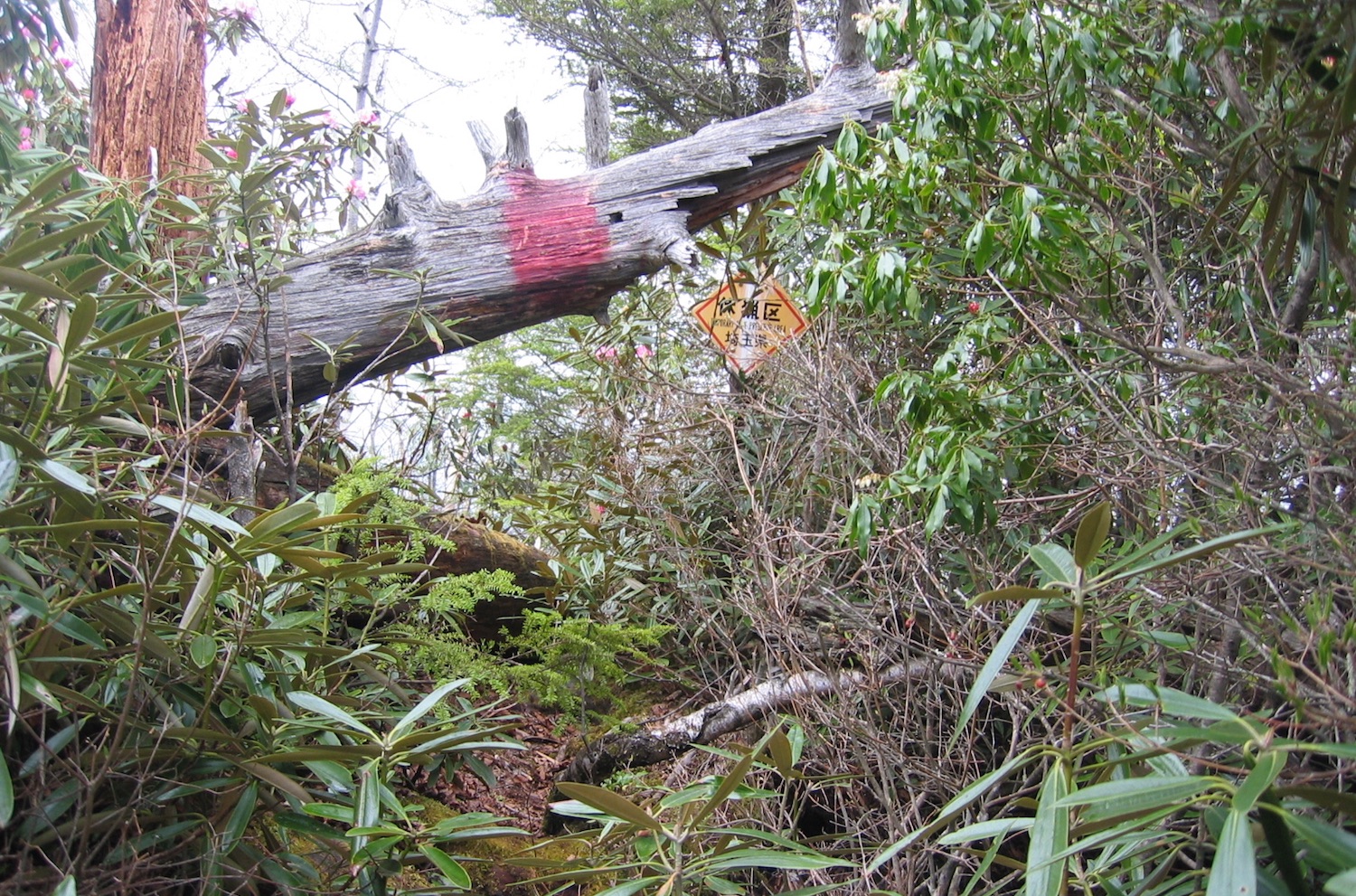 峠からほぼ水平に本来の峠道が延びている。それとは別に少し上にも道がついている。2つの道は県境尾根の1796ピークの先で合流している。糟谷氏が「すさまじい倒木帯を越えて」と記述したのは本来の道の方だ。ここは下見の時に歩いてみたが、すでに歩く人もほととんどいないようで、行く手を阻む倒木や錯綜する獣道で難行苦行を強いられるのである。